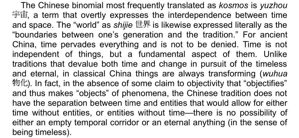 Daoists reject the traditional Greek concept of a single-ordered universe (cosmos) and instead see the world as an endlessly flowing series of interconnected events (“ten thousand things”). There is no ultimate, unchanging reality.