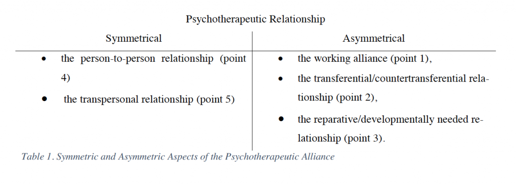 The symmetric aspects of the relationship: In what is considered the humanistic approaches to psychotherapy, the therapist’s work is to be there as a companion to the client, to work with the client in partnership sans analyzing, judgment and oftentimes “helping”, but instead providing unconditional positive regard towards the client. For this to be achieved, there must exist a coming together of\ two authentic individuals as in Carl Roger’s person-centred psychotherapy approach that is “contact-building and acknowledging quality and empathy— without any techniques, means aims or intentions” (Schmid, 2001, p. 1).